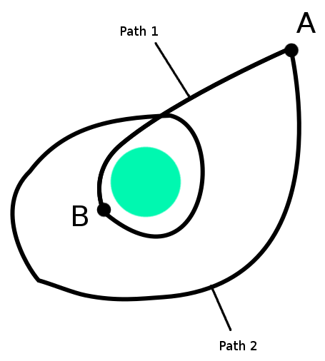 Furthermore, we know that the kinetic energy gain from going from point \(A\) to point \(A\) is also independent of the path you take along the way: in all cases it's exactly zero.