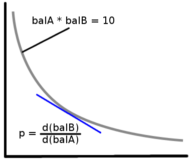 Where \(p\) is the price of \(tokenB\) denominated in \(tokenA\). In general, you can make a path-independent market maker by defining any (monotonic) relation between \(tokenA\_balance\) and \(tokenB\_balance\) and calculating its derivative at any point to give the price.