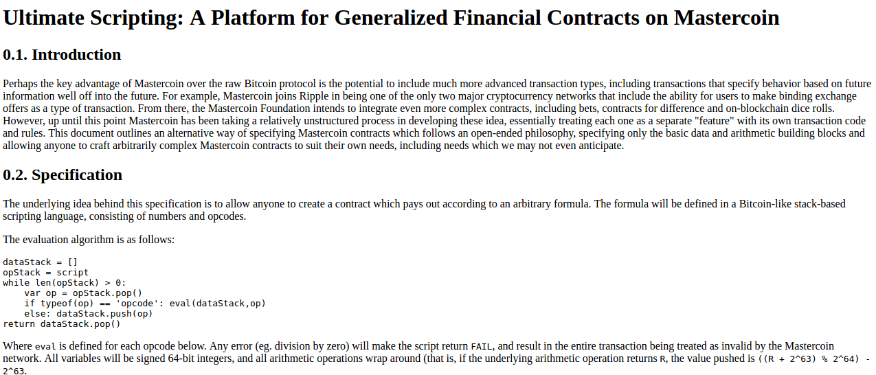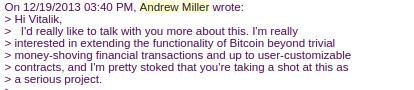 Let us first begin with the very earliest version of what would eventually become Ethereum, back when it was not even called Ethereum. When I was visiting Israel in October 2013, I spent quite a bit of time with the Mastercoin team, and even suggested a few features for them. After spending a couple of times thinking about what they were doing, I sent the team a proposal to make their protocol more generalized and support more types of contracts without adding an equally large and complex set of features: