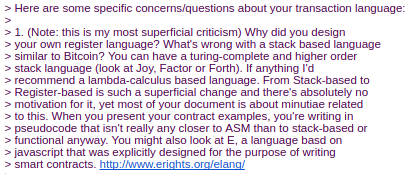 Here you can see the results of a substantial rearchitecting, largely a result of a long walk through San Francisco I took in November once I realized that smart contracts could potentially be fully generalized. Instead of the scripting language being simply a way of describing the terms of relations between two parties, contracts were themselves fully-fledged accounts, and had the ability to hold, send and receive assets, and even maintain a permanent storage (back then, the permanent storage was called "memory", and the only temporary "memory" was the 256 registers). The language switched from being a stack-based machine to being a register-based one on my own volition; I had little argument for this other than that it seemed more sophisticated.
