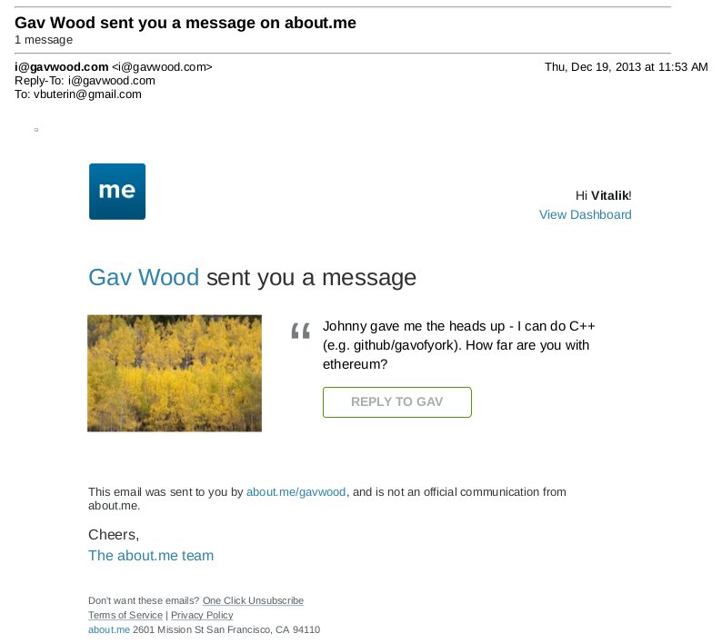 This was the time when the Ethereum protocol was entirely my own creation. From here on, however, new participants started to join the fold. By far the most prominent on the protocol side was Gavin Wood, who reached out to me in an about.me message in December 2013: