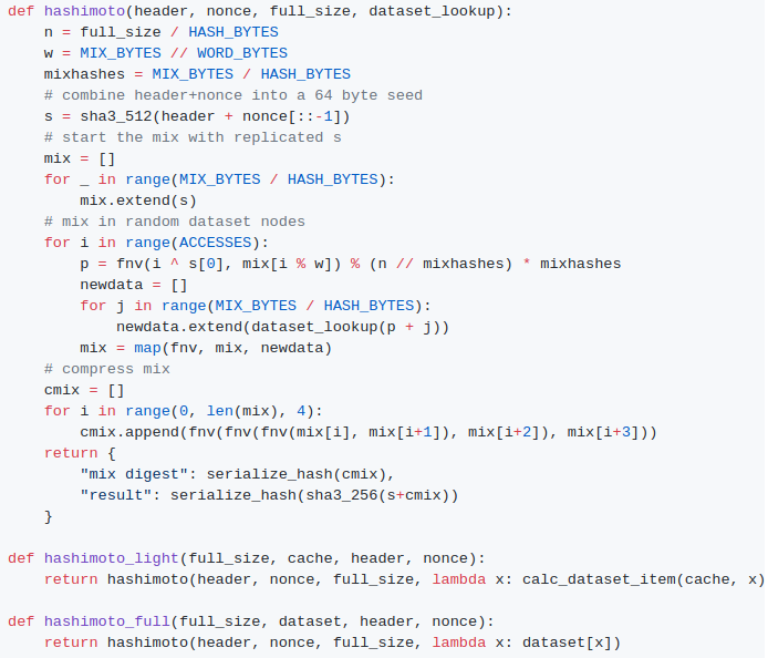 Finally, we came full circle with an algorithm called "Dagger Hashimoto". "Dashimoto", as it was sometimes called in short, borrowed many ideas from Hashimoto, a proof of work algorithm by Thaddeus Dryja that pioneered the notion of "I/O bound proof of work", where the dominant limiting factor in mining speed was not hashes per second, but rather megabytes per second of RAM access. However, it combined this with Dagger's notion of light-client-friendly DAG-generated datasets. After many rounds of tweaking by myself, Matthew, Tim and others, the ideas finally converged into the algorithm we now call Ethash.