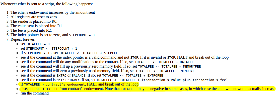 Second, a discussion between him and myself (during a walk in San Francisco, so the exact details will be forever lost to the winds of history and possibly a copy or two in the deep archives of the NSA) led to a re-factoring of the transaction fee model, moving away from the "contract pays" approach to a "sender pays" approach, and also switching to the "gas" architecture. Instead of each individual transaction step immediately taking away a bit of ether, the transaction sender pays for and is allocated some "gas" (roughly, a counter of computational steps), and computational steps drew from this allowance of gas. If a transaction runs out of gas, the gas would still be forfeit, but the entire execution would be reverted; this seemed like the safest thing to do, as it removed an entire class of "partial execution" attacks that contracts previously had to worry about. When a transaction execution finishes, the fee for any unused gas is refunded.