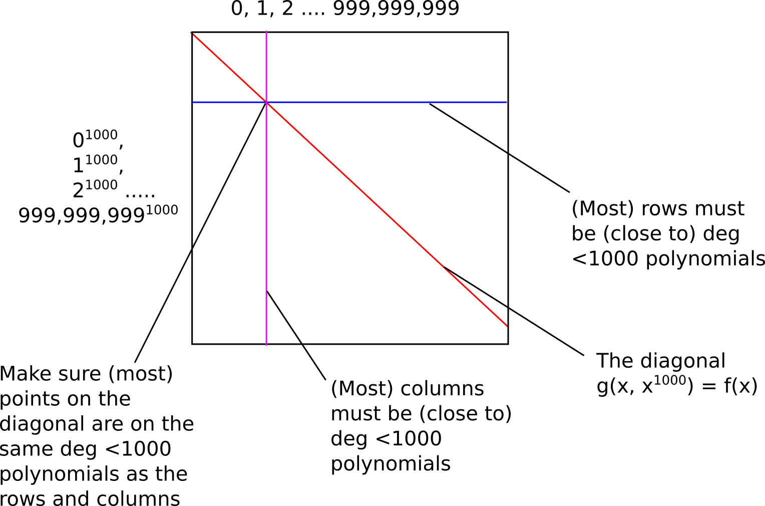 The idea is as follows. Suppose there are N points (we'll say \(N\) = 1 billion), and they are all on a degree \(<\) 1,000,000 polynomial \(f(x)\). We find a bivariate polynomial (ie. an expression like \(1 + x + xy + x^5 \cdot y^3 + x^{12} + x \cdot y^{11}\)), which we will denote \(g(x, y)\), such that \(g(x, x^{1000}) = f(x)\). This can be done as follows: for the \(k\)th degree term in \(f(x)\) (eg. \(1744 \cdot x^{185423}\)), we decompose it into \(x^{k \% 1000} \cdot y^{floor(k / 1000)}\) (in this case, \(1744 \cdot x^{423} \cdot y^{185}\)). You can see that if \(y = x^{1000}\), then \(1744 \cdot x^{423} \cdot y^{185}\) equals \(1744 \cdot x^{185423}\).