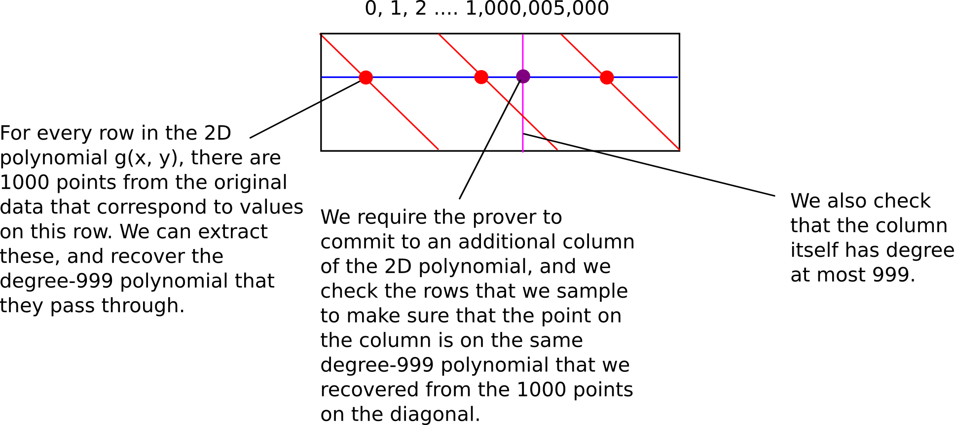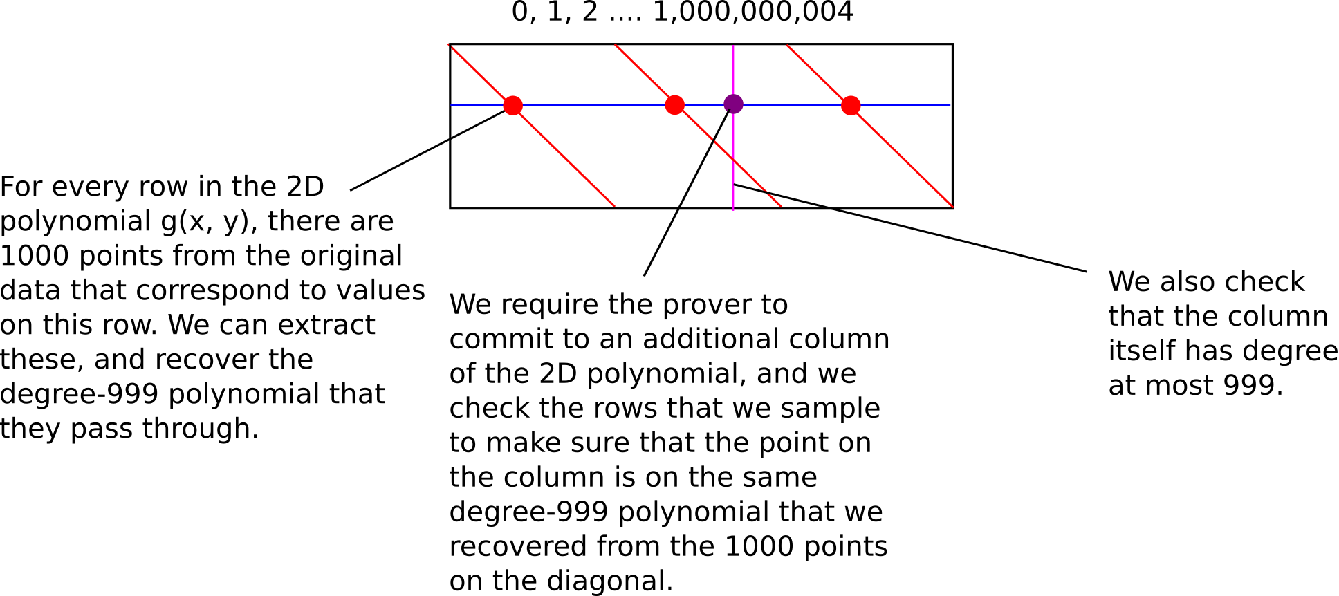 The verifier then randomly picks perhaps a few dozen rows and columns (possibly using the Merkle root of the square as a source of pseudorandomness if we want a non-interactive proof), and for each row or column that it picks the verifier asks for a sample of, say, 1010 points on the row and column, making sure in each case that one of the points demanded is on the diagonal. The prover must reply back with those points, along with Merkle branches proving that they are part of the original data committed to by the prover. The verifier checks that the Merkle branches match up, and that the points that the prover provides actually do correspond to a degree-1000 polynomial.