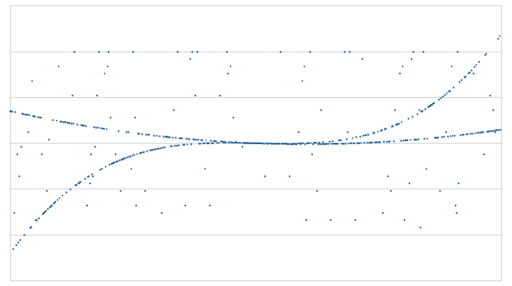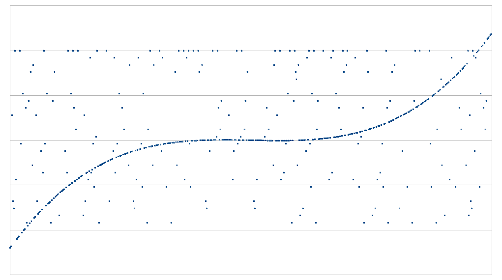 Specifically, we will work with \(p =\) 1,000,005,001. We pick this modulus because (i) it's greater than 1 billion, and we need it to be at least 1 billion so we can check 1 billion points, (ii) it's prime, and (iii) \(p-1\) is an even multiple of 1000. The exponentiation \(x^{1000}\) will have an image of size 1,000,006 - that is, the exponentiation can only give 1,000,006 possible results.
