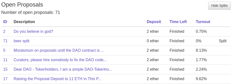 The EIP 186 Carbonvote had ~2.7 million ETH voting. The DAO proposal votes did not fare better, with participation never reaching 10%. And outside of Ethereum things are not sunny either; even in Bitshares, a system where the core social contract is designed around voting, the top delegate in an approval vote only got 17% of the vote, and in Lisk it got up to 30%, though as we will discuss later these systems have other problems of their own.