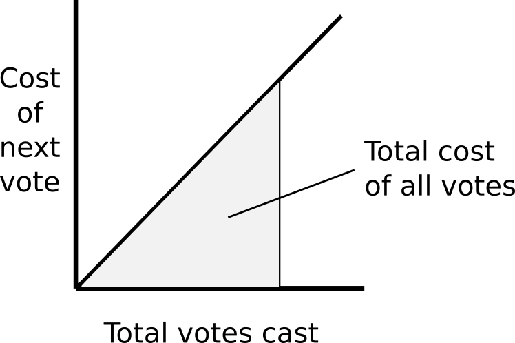Suppose that you can vote as many times as you want, but voting costs "voting tokens" (say each citizen is assigned \(N\) voting tokens per year), and it costs tokens in a nonlinear way: your first vote costs one token, your second vote costs two tokens, and so forth. If someone feels more strongly about something, the argument goes, they would be willing to pay more for a single vote; quadratic voting takes advantage of this by perfectly aligning quantity of votes with cost of votes: if you're willing to pay up to 15 tokens for a vote, then you will keep buying votes until your last one costs 15 tokens, and so you will cast 15 votes in total. If you're willing to pay up to 30 tokens for a vote, then you will keep buying votes until you can't buy any more for a price less than or equal to 30 tokens, and so you will end up casting 30 votes. The voting is "quadratic" because the total amount you pay for \(N\) votes goes up proportionately to \(N^2\).