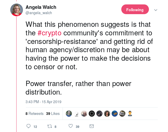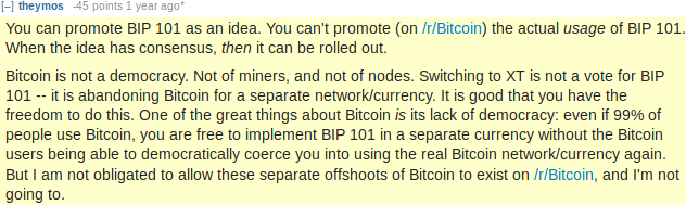 A common, and in my own view frustrating, argument that I often hear is that "freedom of speech" is exclusively a legal restriction on what governments can act against, and has nothing to say regarding the actions of private entities such as corporations, privately-owned platforms, internet forums and conferences. One of the larger examples of "private censorship" in cryptocurrency communities was the decision of Theymos, the moderator of the /r/bitcoin subreddit, to start heavily moderating the subreddit, forbidding arguments in favor of increasing the Bitcoin blockchain's transaction capacity via a hard fork.