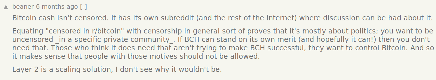 If, instead, Theymos had created a subreddit called /r/bitcoinsmallblockers, and explicitly said that it was a curated space for small block proponents and attempting to instigate controversial hard forks was not welcome, then it seems likely that very few people would have seen anything wrong about this. They would have opposed his ideology, but few (at least in blockchain communities) would try to claim that it's improper for people with ideologies opposed to their own to have spaces for internal discussion. But back in reality, Theymos tried to "annex a public space and demand that people within the space confirm to his private norms", and so we have the Bitcoin community block size schism, a highly acrimonious fork and chain split, and now a cold peace between Bitcoin and Bitcoin Cash.