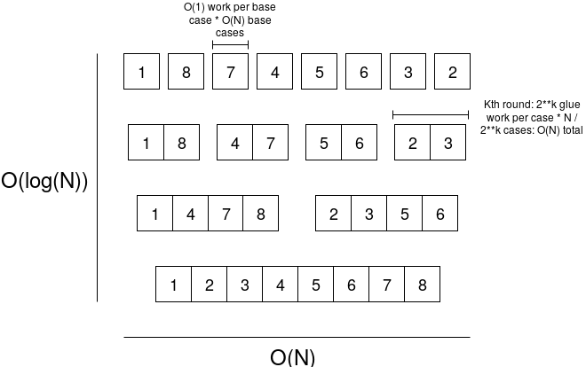 Note that the "glue" in the second procedure has runtime \(O(N)\): if each of the two sub-lists has \(N\) elements, then you need to run through every item in each list once, so it's \(O(N)\) computation total. So the algorithm as a whole works by taking a problem of size \(N\), and breaking it up into two problems of size \(\frac{N}{2}\), plus \(O(N)\) of "glue" execution. There is a theorem called the Master Theorem that lets us compute the total runtime of algorithms like this. It has many sub-cases, but in the case where you break up an execution of size \(N\) into \(k\) sub-cases of size \(\frac{N}{k}\) with \(O(N)\) glue (as is the case here), the result is that the execution takes time \(O(N \cdot log(N))\).