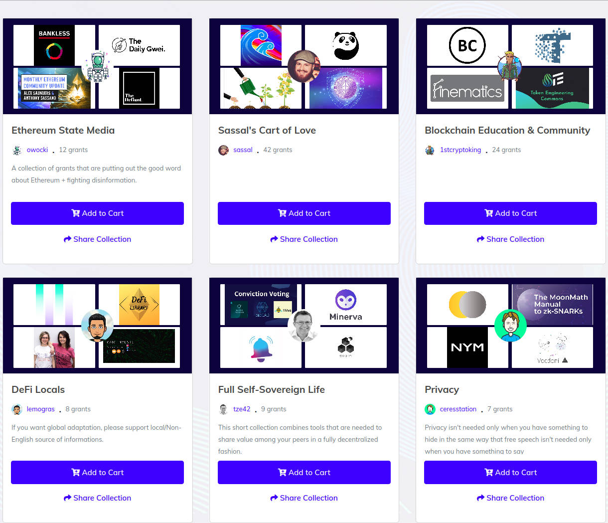If you click "Add to Cart" on a collection, you immediately add everything in the collection to your cart. This is strange because this mechanism seems to send the exact opposite message: users that don't understand the details well can choose to allocate funds to entire categories, but (unless they manually edit the amounts) they should not be making many active decisions within each category.
