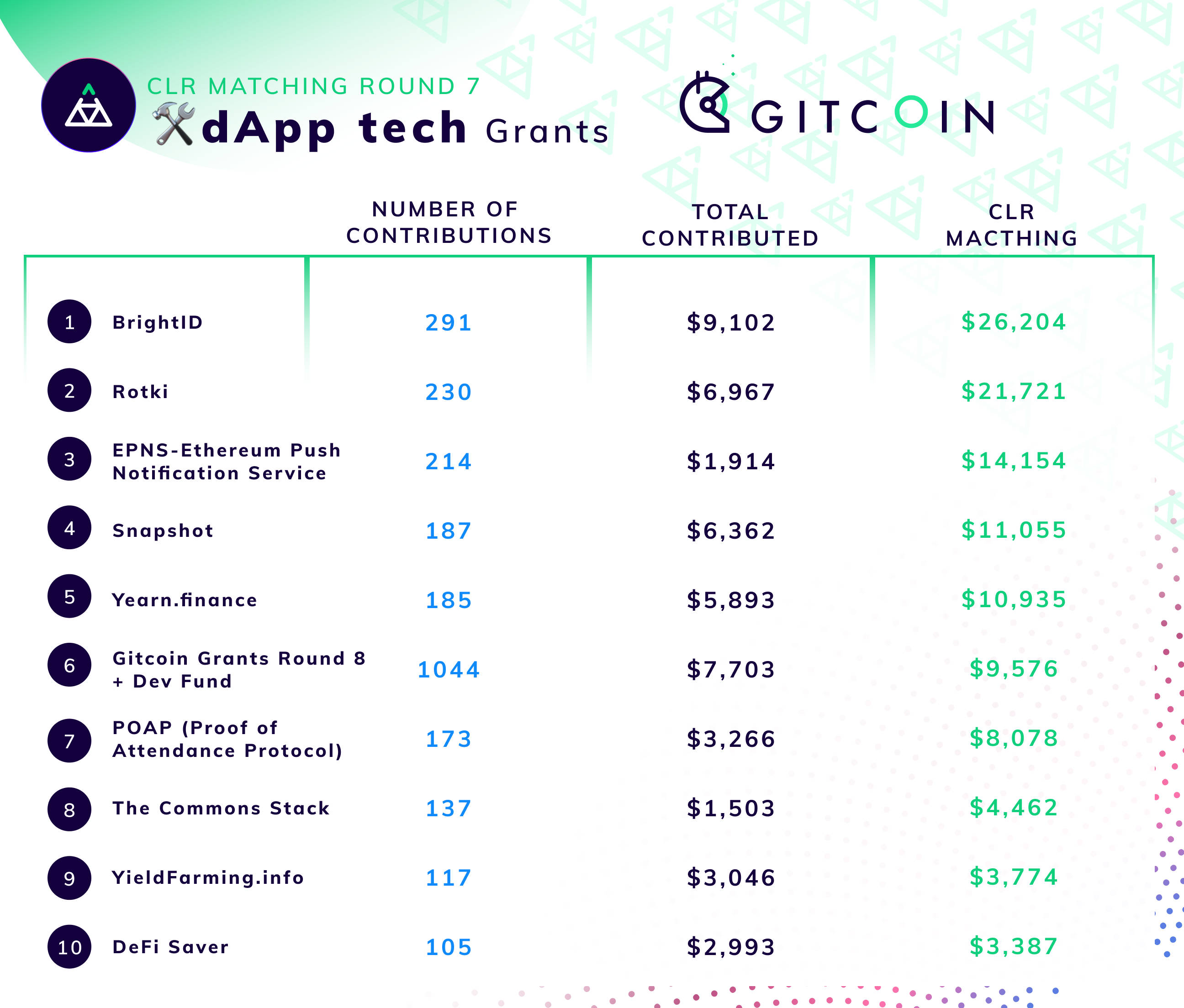Round 7 of Gitcoin Grants has successfully completed! This round has seen an unprecedented growth in interest and contributions, with $274,830 in contributions and $450,000 in matched funds distributed across 857 projects.