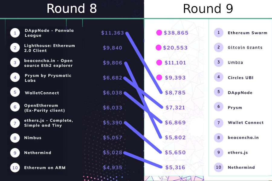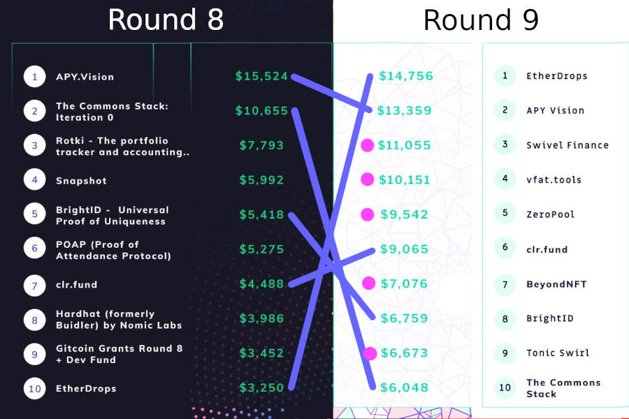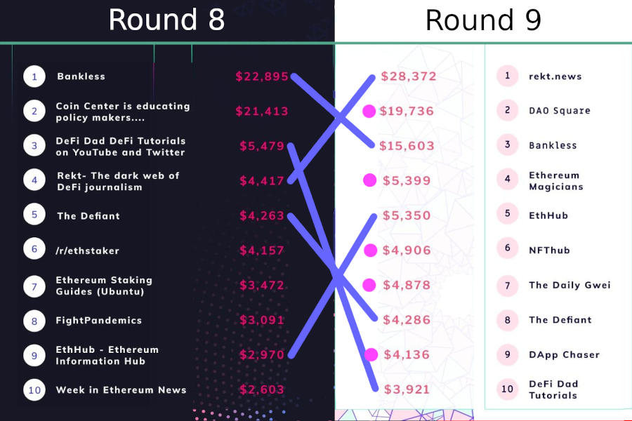 In all cases, about half of the top-10 carries over from the previous round and about half is new (the flipside, of course is that half the top-10 drops out). The charts are a slight understatement: the Gitcoin Grants dev fund and POAP appear to have dropped out but actually merely changed categories, so something like 40% churn may be a more accurate number.