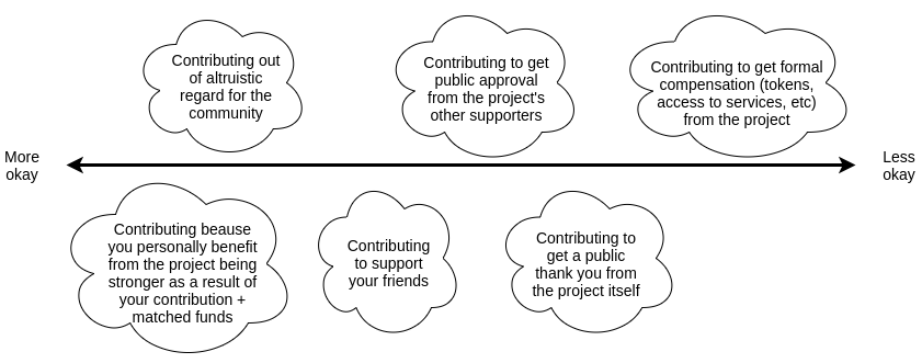 Note that this is a somewhat unusual "moral hierarchy". Normally, the more acceptable motivations would be the altruistic ones, and the less acceptable motivations would be the selfish ones. Here, though, the motivations closest to the left and the right are selfish; the altruistic motivation is close to the left, but it's not the only motivation close to the left. The key differentiator is something more subtle: are you contributing because you like the consequences of the project getting funded (inside-the-mechanism), or are you contributing because you like some (outside-the-mechanism) consequences of you personally funding the project?