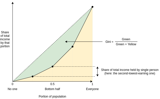 Area-above-curve definition: draw the graph of a function, where \(f(p)\) equals the share of total income earned by the lowest-earning portion of the population (eg. \(f(0.1)\) is the share of total income earned by the lowest-earning 10%). The Gini coefficient is the area between that curve and the \(y=x\) line, as a portion of the whole triangle: