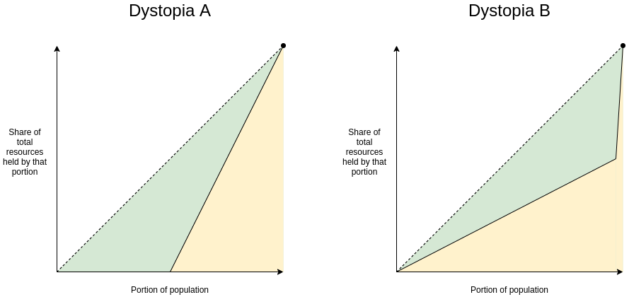 - Dystopia B: one person has half of all the resources, everyone else equally shares the remaining half