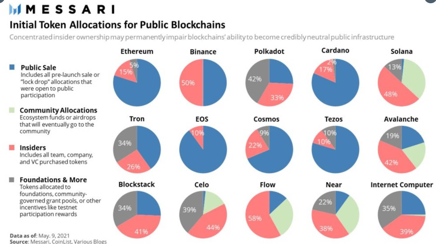 Share of coins explicitly allocated to specific insiders in a cryptocurrency's initial supply is one type of inequality. Note that the Ethereum data is slightly wrong: the insider and foundation shares should be 12.3% and 4.2%, not 15% and 5%.