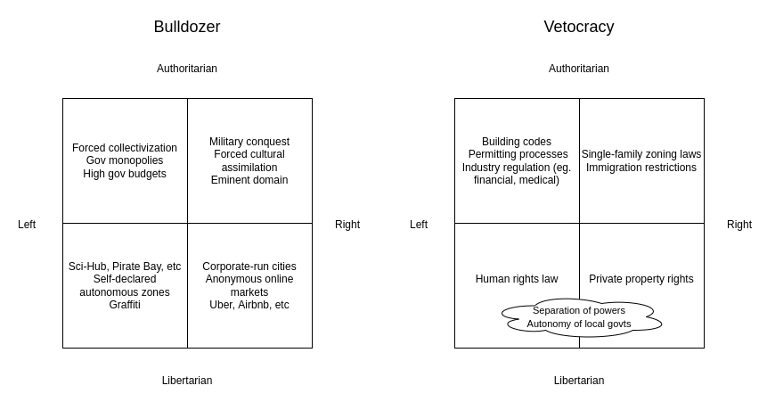 Note that this is not the same as either authoritarian vs libertarian or left vs right. You can have vetocratic authoritarianism, the bulldozer left, or any other combination. Here are a few examples: