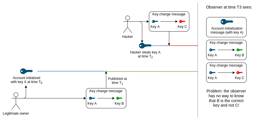 - A year later, a hacker actually does steal key A. They sign a message saying with A saying "I use C now", where C is their own key