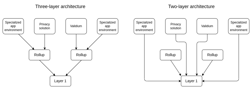 A three-layer scaling architecture that consists of stacking the same scaling scheme on top of itself generally does not work well. Rollups on top of rollups, where the two layers of rollups use the same technology, certainly do not. A three-layer architecture where the second layer and third layer have different purposes, however, can work. Validiums on top of rollups do make sense, even if they're not certain to be the long-term best way of doing things.