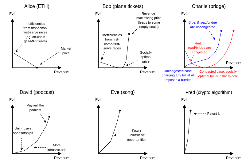 Here is a rough attempt at plotting the revenue-evil curves of our six examples above: