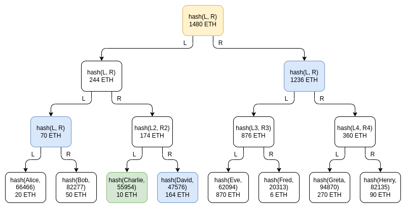 Privacy leakage in this design is much lower than with a fully public list, and it can be decreased further by shuffling the branches each time a root is published, but some privacy leakage is still there: Charlie learns that someone has a balance of 164 ETH, some two users have balances that add up to 70 ETH, etc. An attacker that controls many accounts could still potentially learn a significant amount about the exchange's users.