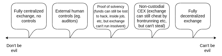 Even more ambitiously, an exchange could build a system where it can't withdraw a depositor's funds at all without their consent. Potentially, we could explore the entire spectrum between the "don't be evil" aspiring-good-guy CEX and the "can't be evil", but for-now inefficient and privacy-leaking, on-chain DEX. This post will get into the history of attempts to move exchanges one or two steps closer to trustlessness, the limitations of these techniques, and some newer and more powerful ideas that rely on ZK-SNARKs and other advanced technologies.