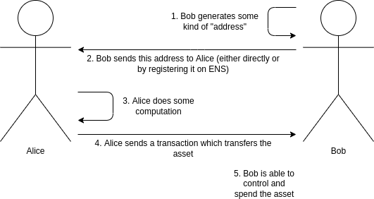 Suppose that Alice wants to send Bob an asset. This could be some quantity of cryptocurrency (eg. 1 ETH, 500 RAI), or it could be an NFT. When Bob receives the asset, he does not want the entire world to know that it was he who got it. Hiding the fact that a transfer happened is impossible, especially if it's an NFT of which there is only one copy on-chain, but hiding who is the recipient may be much more viable. Alice and Bob are also lazy: they want a system where the payment workflow is exactly the same as it is today. Bob sends Alice (or registers on ENS) some kind of "address" encoding how someone can pay him, and that information alone is enough for Alice (or anyone else) to send him the asset.