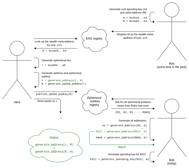 m) and stealth meta-address (M).Mas the stealth meta-address forbob.eth.bob.eth. Alice looks up his stealth meta-addressMon ENS.This all relies on two uses of cryptographic trickery. First, we need a pair of algorithms to generate a shared secret: one algorithm which uses Alice's secret thing (her ephemeral key) and Bob's public thing (his meta-address), and another algorithm which uses Bob's secret thing (his root spending key) and Alice's public thing (her ephemeral public key). This can be done in many ways; Diffie-Hellman key exchange was one of the results that founded the field of modern cryptography, and it accomplishes exactly this.