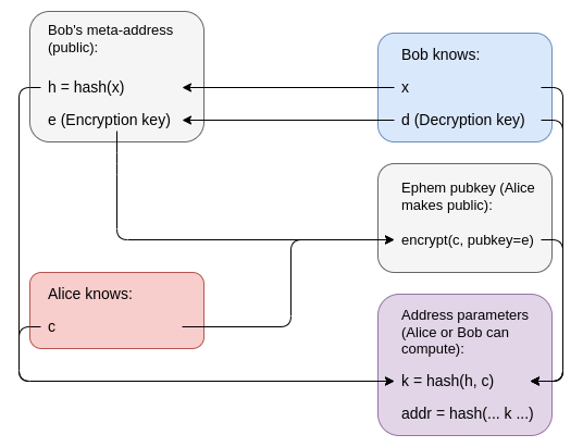 - Alice generates an ephemeral key that only she knows, and that she only uses once (to generate this specific stealth address).