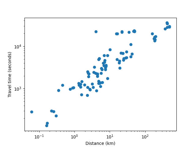 As another exercise in using ChatGPT 3.5 to do weird things and seeing what happens, I decided to explore an interesting question: how does the time it takes to travel from point A to point B scale with distance, in the real world? That is to say, if you sample randomly from positions where people are actually at (so, for example, 56% of points you choose would be in cities), and you use public transportation, how does travel time scale with distance?