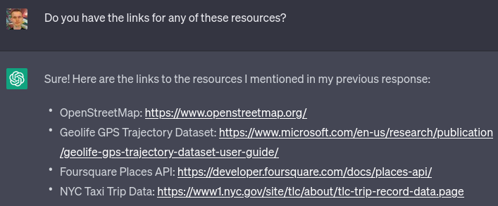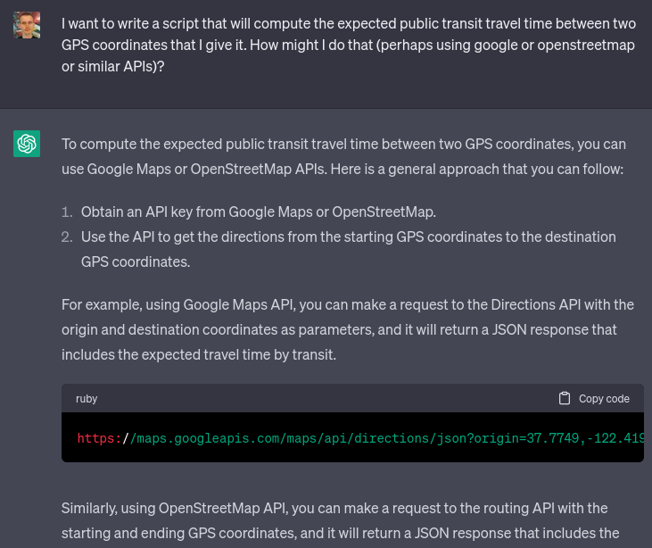 - Asking how to get an API key for the Google Maps Directions API (it gave an answer that seems to be outdated, but that succeeded at immediately pointing me to the right place)