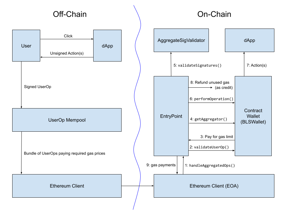 Diagram from a BLS wallet implementation post showing the workflow of BLS aggregate signatures within an earlier version of ERC-4337. The workflow of aggregating cross-chain proofs will likely look very similar.