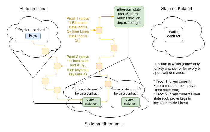 Let's assume that the keystore is on Linea, and the wallet is on Kakarot. A full proof of the keys to the wallet consists of:
