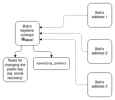 initcode, can only contain the wallet's initial verification key. The current verification key would be stored in the wallet's storage, but that storage record does not magically propagate to other L2s.If a user has many addresses on many L2s, including addresses that (because they are counterfactual) the L2 that they are on does not know about, then it seems like there is only one way to allow users to change their keys: asset / keystore separation architecture. Each user has (i) a "keystore contract" (on L1 or on one particular L2), which stores the verification key for all wallets along with the rules for changing the key, and (ii) "wallet contracts" on L1 and many L2s, which read cross-chain to get the verification key.