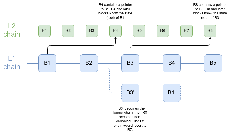 Blocks of the L2 chain can have dependencies on not just previous L2 blocks, but also on an L1 block. If L1 reverts past such a link, the L2 reverts too. It's worth noting that this is also how an earlier (pre-Dank) version of sharding was envisioned to work; see here for code.
