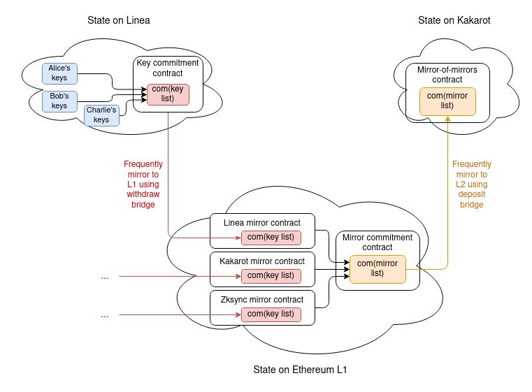 Hence, we have a structure where we can just keep adding values to the end of an ever-growing list, though with a certain size limit (realistically, hundreds of millions could be viable). We then use that as our data structure to manage (i) a commitment to the list of keys on each L2, stored on that L2 and mirrored to L1, and (ii) a commitment to the list of L2 key-commitments, stored on the Ethereum L1 and mirrored to each L2.