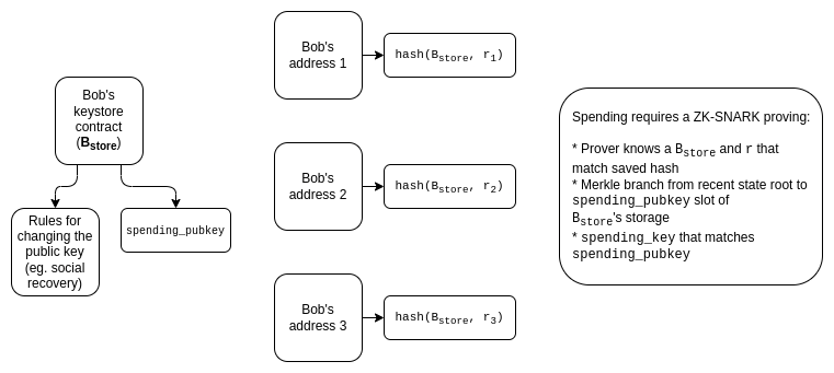 - To have cross-chain social recovery wallets, the most realistic workflow is a wallet that maintains a keystore in one location, and wallets in many locations, where wallet reads the keystore either (i) to update their local view of the verification key, or (ii) during the process of verifying each transaction.