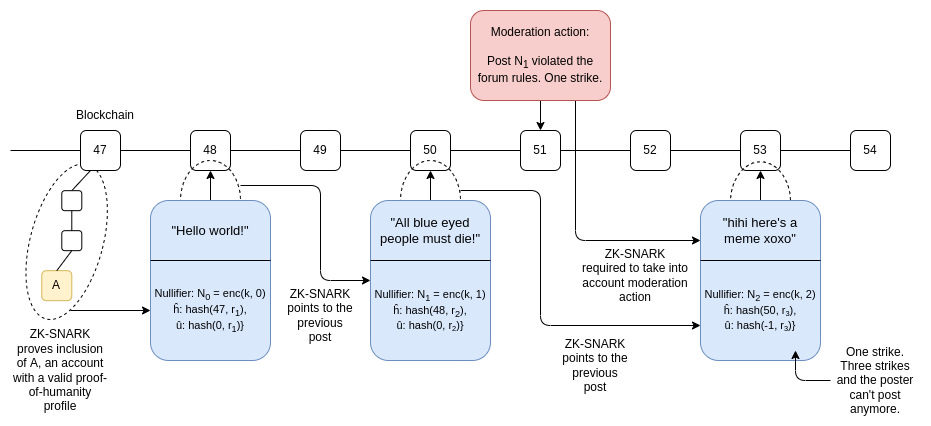 A proposed design for a ZK social media system, where moderation actions can happen and users can be penalized, all without needing to know anyone's identity.
