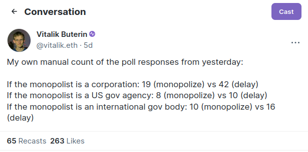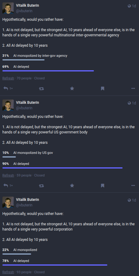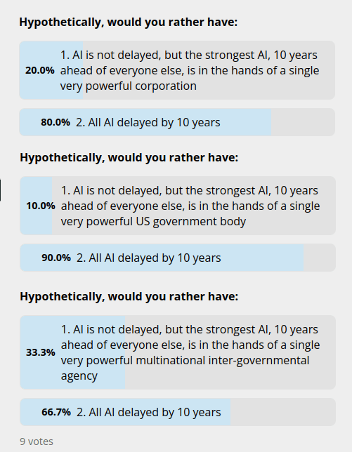 The main practical issue that I see with this so far is that people don't seem to actually trust any specific governance mechanism with the power to build such a thing. This fact becomes stark when you look at the results to my recent Twitter polls, asking if people would prefer to see AI monopolized by a single entity with a decade head-start, or AI delayed by a decade for everyone: