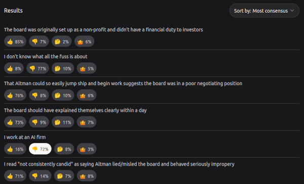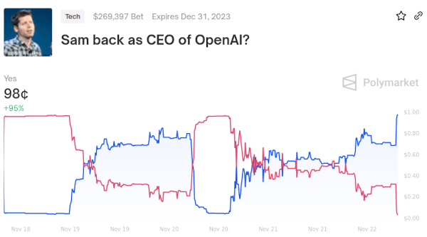 I am also a fan of prediction markets, which can help identify the significance of events in real time, before the dust settles and there is consensus on which direction is which. The Polymarket on Sam Altman is very helpful in giving a useful summary of the ultimate consequences of hour-by-hour revelations and negotiations, giving much-needed context to people who only see the individual news items and don't understand the significance of each one.