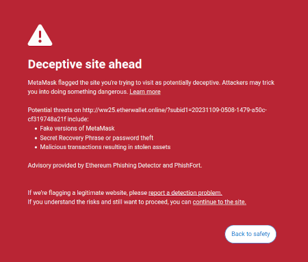 Within the blockchain space, there is a particular type of info defense that I think we need much more of. Namely, wallets should be much more opinionated and active in helping users determine the meaning of things that they are signing, and protecting them from fraud and scams. This is an intermediate case: what is and is not a scam is less subjective than perspectives on controversial social events, but it's more subjective than telling apart legitimate users from DoS attackers or hackers. Metamask has an scam database already, and automatically blocks users from visiting scam sites: