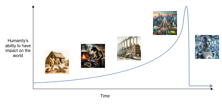 But there is a different way to think about what AI is: it's a new type of mind that is rapidly gaining in intelligence, and it stands a serious chance of overtaking humans' mental faculties and becoming the new apex species on the planet. The class of things in that category is much smaller: we might plausibly include humans surpassing monkeys, multicellular life surpassing unicellular life, the origin of life itself, and perhaps the Industrial Revolution, in which machine edged out man in physical strength. Suddenly, it feels like we are walking on much less well-trodden ground.